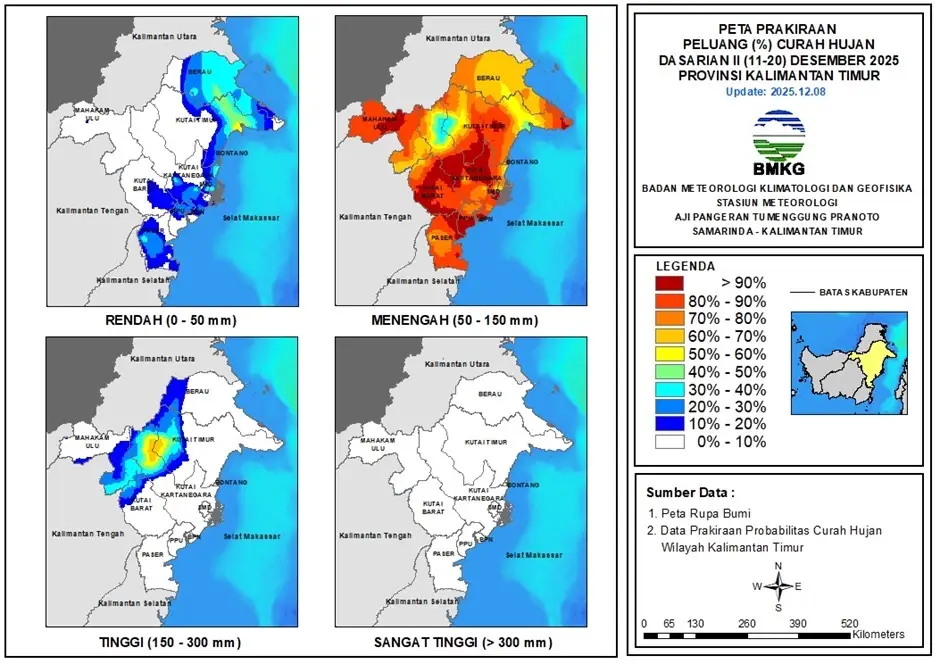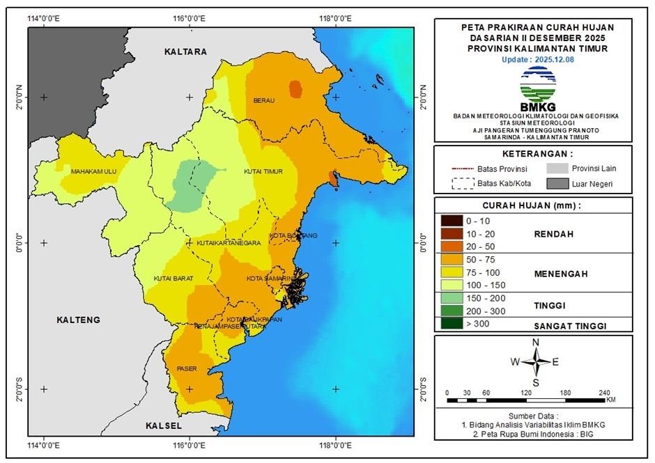 Untuk prakiraan deterministik curah hujan pada Dasarian II Desember 2025, sebagian besar wilayah Kaltim juga diprediksi tetap berada dalam kategori Menengah (50-150 mm).