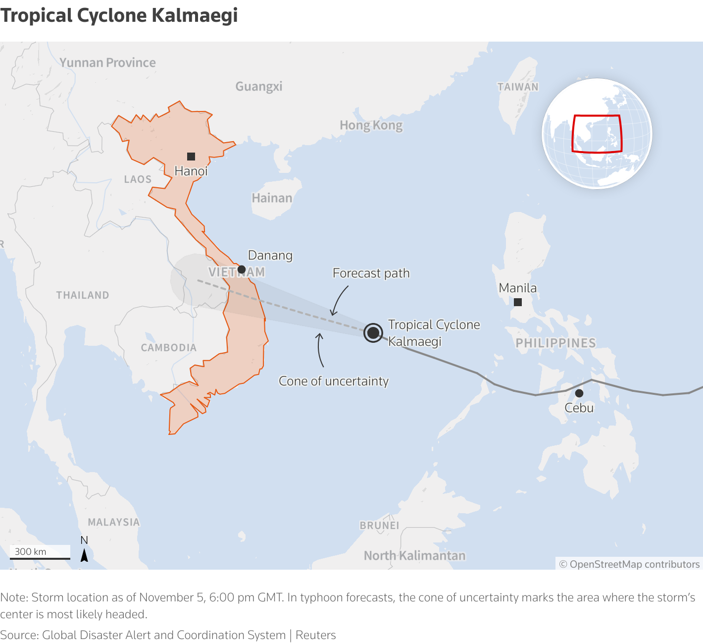 Foto: Jalur siklon saat ini melewati Filipina dekat kota Cebu. Siklon ini diprediksi melintasi Laut China Selatan dan kemungkinan mendarat kembali di Vietnam. Sumber: (Reuters)
