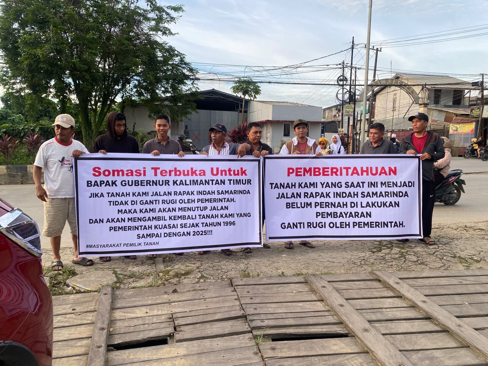 “Somasi terbuka untuk Bapak Gubernur Kalimantan Timur: Jika tanah kami di jalan Rapak Indah Samarinda tidak diganti rugi oleh pemerintah, maka kami akan menutup jalan dan mengambil kembali tanah kami yang pemerintah kuasai sejak tahun 1996 sampai dengan 2025,” tertulis dalam spanduk itu.